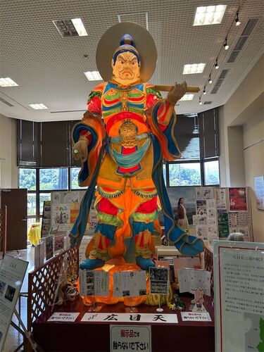 久々に来た道の駅大和路平群。見慣れない仏像がお出迎え。いやちょっと仏像か人の像かわからない感じだ。広目天というそうな。広目天は四天王の1人で、西方を守護する情報の神ということ。右手に筆、左手に巻物を持っている。